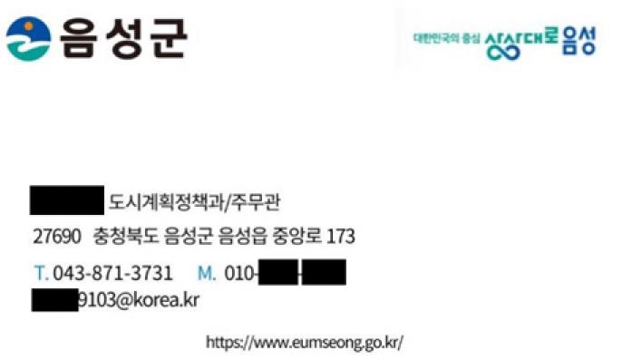 [뉴스다컴] 음성군은 지난 공문서 및 공인 위조 사기 사건에 이어 이번에는 군청 소속 공무원의 실명을 도용한 위조된 명함을 사용한 사기 시도 사건이 발생해 관내 업체 등에 각별한 주의를 당부하고 나섰다.