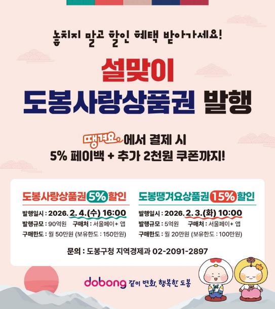 [뉴스다컴] 서울 도봉구가 민족 대명절 설을 맞아 90억 원 규모의 도봉사랑상품권과 5억 원 규모의 도봉땡겨요상품권을 발행한다.