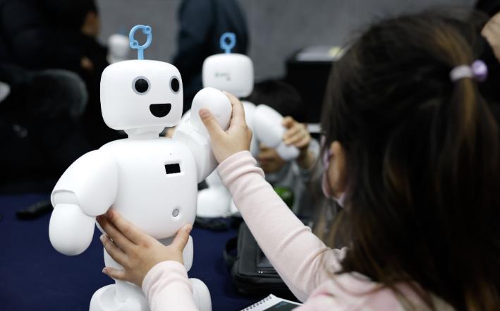 | ▲ ’25. 2. ‘초등학생 AI친구 로봇사업 설명회’에서 한 어린이가 로봇 사용법을 배우고 있다 |