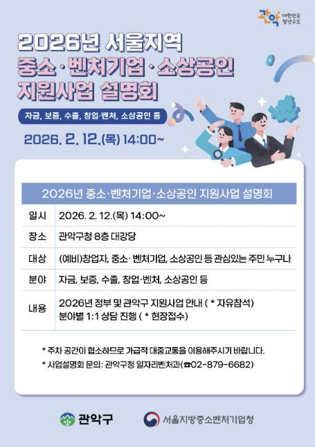 [뉴스다컴] 관악구가 지역 경제의 주축인 중소·벤처기업과 소상공인의 경영 안정을 돕고, 혁신 성장의 발판을 마련하기 위한 대규모 정책 소통의 장인 오는 12일(목) 14시 관악구청 8층 대강당에서 ‘2026년 중소벤처기업·소상공인 지원사업 설명회’를 개최한다.