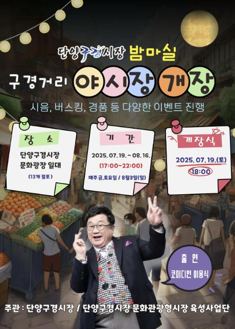 운영은 7월 19일부터 8월 16일까지 매주 금·토요일, 여름 성수기인 8월 3일(일)을 포함해 총 10회, 오후 5시부터 10시까지 단양구경시장 문화광장 일대에서 진행된다.