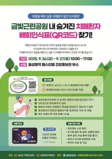 [뉴스다컴] 음성군 치매안심센터는 이달 26일부터 27일까지 금왕읍 금빛근린공원 일원에서 치매환자 실종 예방과 치매 인식 개선을 위한 ‘숨겨진 배회인식표(QR코드) 찾기’ 체험행사를 개최한다고 밝혔다.