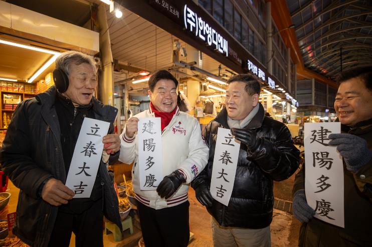 특히 이번 일정은 4일 ‘입춘’을 앞두고 진행돼 분위기가 남달랐다. 입춘은 24절기 가운데 첫 절기로 ‘봄의 시작’을 알리는 날로, 예로부터 대문에 ‘입춘첩’을 붙이며 한 해의 복을 기원해 왔다. 이 구청장과 상인들은 ‘입춘대길 건양다경(立春大吉 建陽多慶)’이라 적힌 종이를 함께 들어 보이며 환하게 웃는 사진을 남기기도 했다. 이 문구는 입춘에 많이 쓰이는 글귀로 “봄이 드니 크게 길하고, 좋은 경사가 많기를 바란다”는 뜻을 담는다. 구는 “설을 앞둔 시장의 분주함과 입춘이 상징하는 새출발의 기운이 맞물려, 주민과 상인 모두에게 작은 희망이 되길 바라는 마음”이라고 전했다.