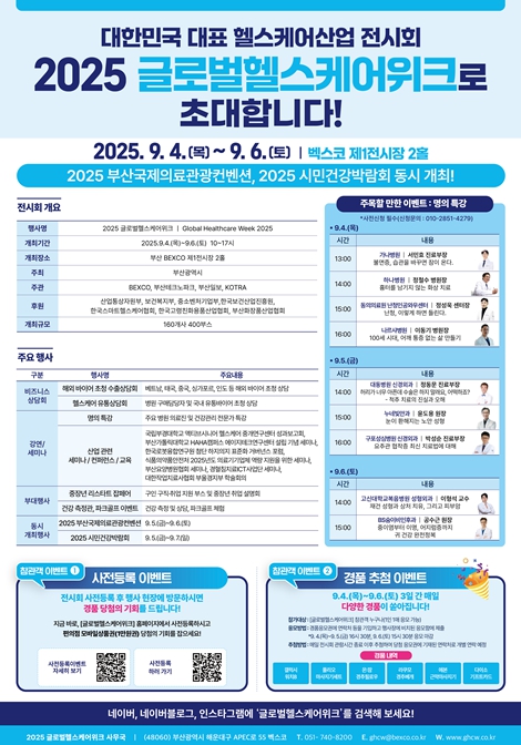 [뉴스다컴] 부산시는 오는 4일부터 6일까지 벡스코 제1전시장에서 ▲복지 재활 ▲항노화 ▲화장품 산업의 발전과 ▲해외 시장 개척을 위한 '2025 글로벌 헬스케어 위크'를 개최한다고 밝혔다.