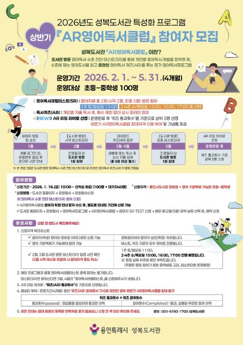 [뉴스다컴] 용인특례시 성복도서관은 오는 16일부터 2026년 ‘AR(Accelerated Reader)영어독서클럽’ 상반기 참여자 100명을 모집한다고 15일 밝혔다.