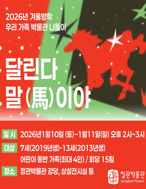 [뉴스다컴] 부산시립박물관 소속 정관박물관은 다가오는 2026년 병오년(丙午年) '붉은 말의 해'를 맞아, 내년 1월 10일부터 11일 양일간 겨울방학 가족 교육프로그램 '겨울방학 우리 가족 박물관 나들이-달린다 말(馬)이야'를 운영한다고 밝혔다.