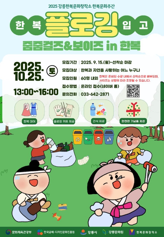 [뉴스다컴] 강릉한복문화창작소는 2025년 한복문화주간을 맞아 오는 10월 25일 한복 입고 플로깅 '줍줍걸즈·보이즈 in 한복'을 진행한다.