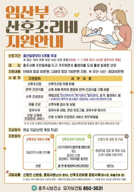 [뉴스다컴] 충주시는 출산과 양육에 대한 부담을 완화하고 산모의 신체적·정신적 회복을 지원하기 위해 산후조리비 지원 대상과 신청 방식을 확대한다고 15일 밝혔다.