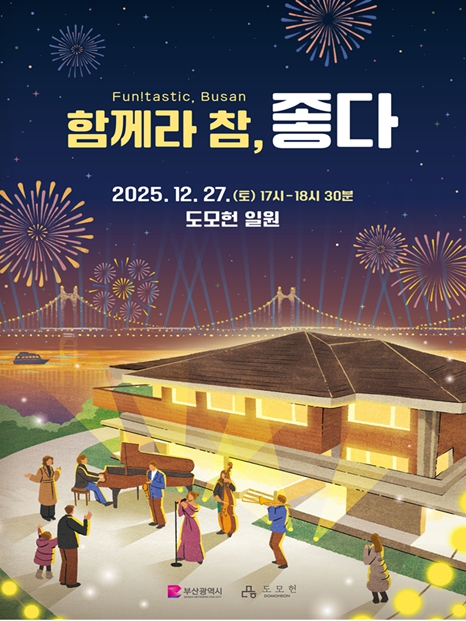 [뉴스다컴] 부산시는 오는 12월 27일 오후 4시 30분, 시민을 위한 열린 복합문화공간 도모헌(구 시장관사) 다할 강연장에서 시민 누구나 함께 즐길 수 있는 연말 콘서트 '함께라 참, 좋다 펀!타스틱 부산(Fun!tastic Busan)'을 개최한다고 밝혔다.