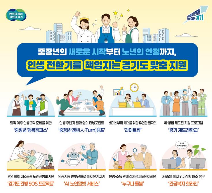 [뉴스다컴] 퇴직 이후의 삶을 어떻게 꾸려야 할지 고민하는 중장년부터, 간병과 돌봄 문제로 어려움을 겪는 어르신과 가족까지. 경기도는 올해도 도민이 인생의 전환기에서 새로운 기회를 얻고 안정적으로 생활할 수 있도록 맞춤형 정책을 계속해 나간다.