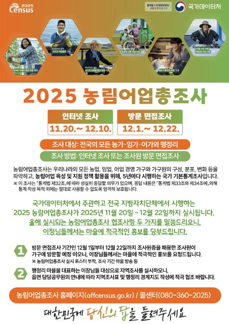 [뉴스다컴] 예천군은 12월 1일부터 22일까지 인터넷 참여가 어려운 가구를 대상으로 ‘2025 농림어업총조사’를 방문하여 실시한다.