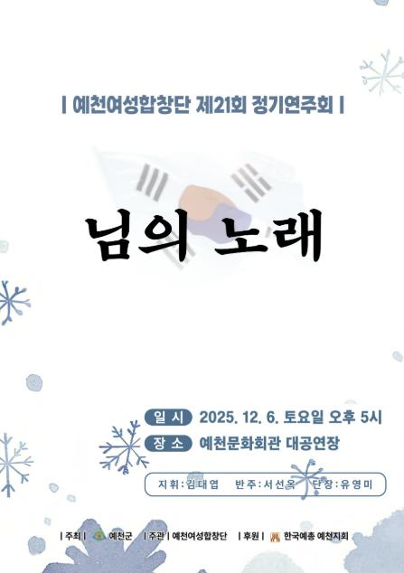 [뉴스다컴] 순수와 열정으로 가득한 예천여성합창단의 ‘제21회 정기연주회’가 6일 오후 5시, 예천군문화회관에서 열릴 예정이다.