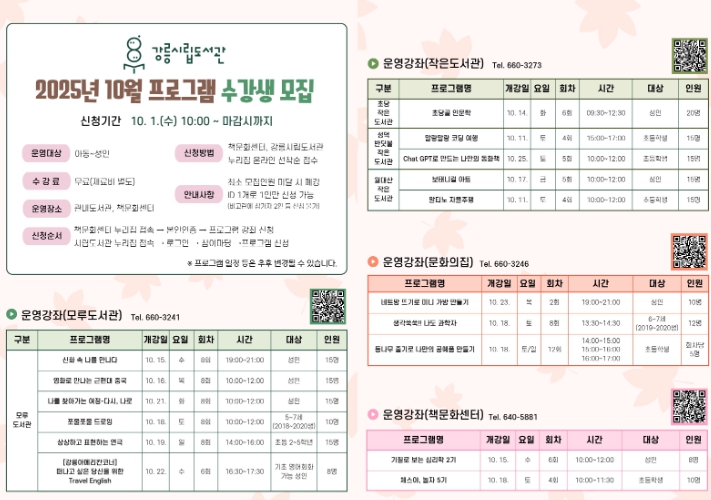 [뉴스다컴] 강릉시립도서관은 오는 10월 1일부터 '2025년 10월 프로그램'에 참여할 수강생을 모집한다.