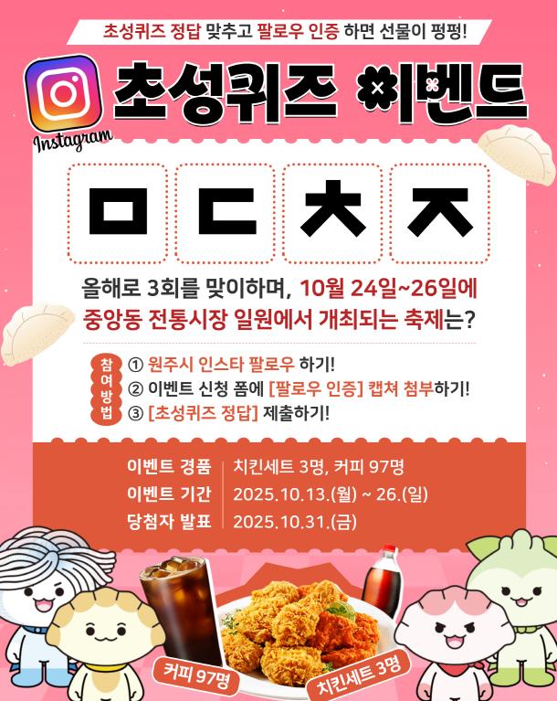 이번 초성퀴즈 제시어는 ‘ㅁㄷㅊㅈ’이며, 문제는 10월 24일부터 26일까지 3일간 원주 중앙동 전통시장 일원에서 열리는 축제의 이름이다.