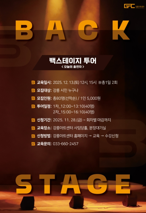 심규만 강릉아트센터 관장은 “백스테이지 투어는 무대 뒤의 숨은 노력이 어떻게 한 편의 공연으로 완성되는지 몸으로 느끼는 시간”이라며, “어린이와 가족이 공연예술의 매력에 자연스럽게 가까워지는 계기가 되길 바란다.”고 밝혔다.
