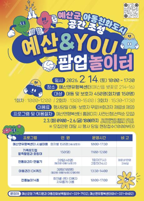 이용을 희망하는 아동과 가족은 2월 3일부터 6일까지 예산앤유 누리집을 통해 프로그램별 사전 예약을 할 수 있으며, 선착순 모집으로 인원 충족 시 조기 마감된다.