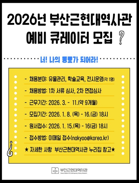 [뉴스다컴] 부산근현대역사관은 박물관 학예 분야 전문인력 양성과 청년 일자리 창출을 위해 오늘(8일)부터 1월 16일까지 '2026년 부산근현대역사관 예비 큐레이터(기간제근로자)'를 공개 모집한다고 밝혔다.