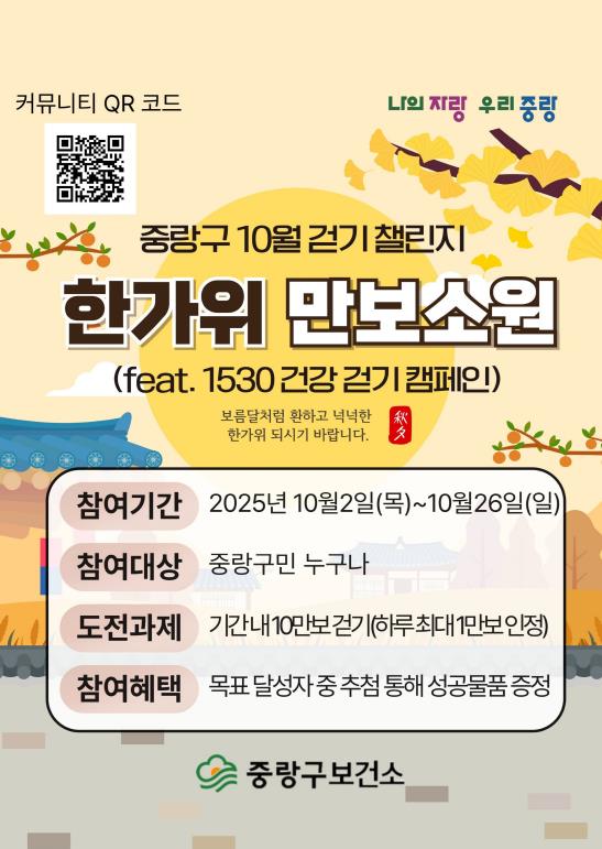 [뉴스다컴] 중랑구는 모바일 걷기 앱을 활용한 '온라인 걷기 챌린지'를 10월 2일부터 26일까지 25일간 운영한다. 이번 챌린지는 구민들의 일상 속 걷기 실천율을 높이고, 건강한 생활습관을 유도하기 위해 마련됐다.