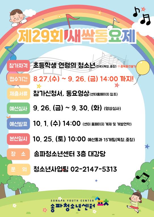1997년 시작해 올해 29회를 맞은 ▲새싹동요제는 서울 자치구에서 가장 오래된 어린이 음악제로, 대중가요에 익숙해진 어린이들의 순수함과 동심을 일깨우는 데 이바지해왔다. 올해는 독창과 중창 부문을 모집한다.