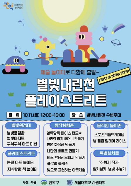 한편 이번 행사는 관내 학생들에게 맞춤형 학습지도를 제공하는 서울대 쌤(SAM) 멘토링에서 진행한 ‘예체능 멘토링’의 성과를 공유하는 자리로 마련된다. 예술 놀이터는 ▲별빛원정대 탐험 ▲창작 체험존 ▲움직임 놀이존 ▲플레이 스트리트 ▲얼키설키 별빛 수놓기 프로그램 등으로 구성될 예정이다