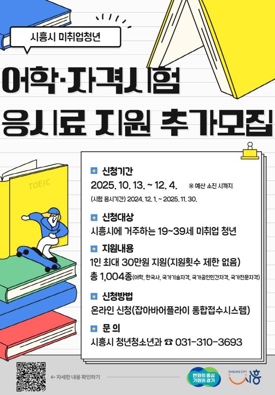 [뉴스다컴] 시흥시는 10월 13일부터 관내 취업 준비 청년들의 능력개발을 돕기 위한 어학ㆍ자격시험 응시료 지원 3차 모집을 실시한다.
