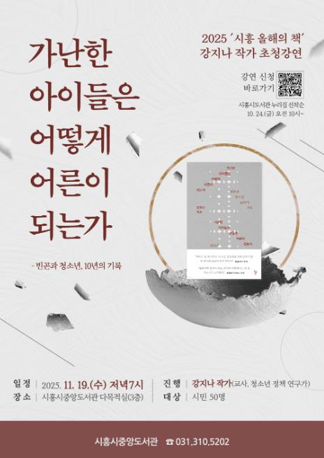 [뉴스다컴] 시흥시 중앙도서관은 ‘2025년 시흥 올해의 책’으로 선정된 '가난한 아이들은 어떻게 어른이 되는가'의 저자 강지나 작가를 초청해 11월 19일 오후 7시 중앙도서관 3층 다목적실에서 시민 강연회를 개최한다.