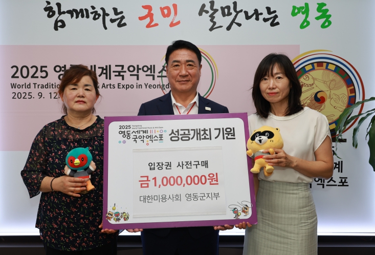 기탁식은 영동군청에서 열렸으며, 오정숙 지부장은 “회원들의 회비를 모아 따뜻한 응원의 마음으로 입장권을 구매했다”며 “지역의 큰 행사인 만큼 영동군지부도 성공적인 개최를 위해 함께 힘을 보태겠다”고 전했다.