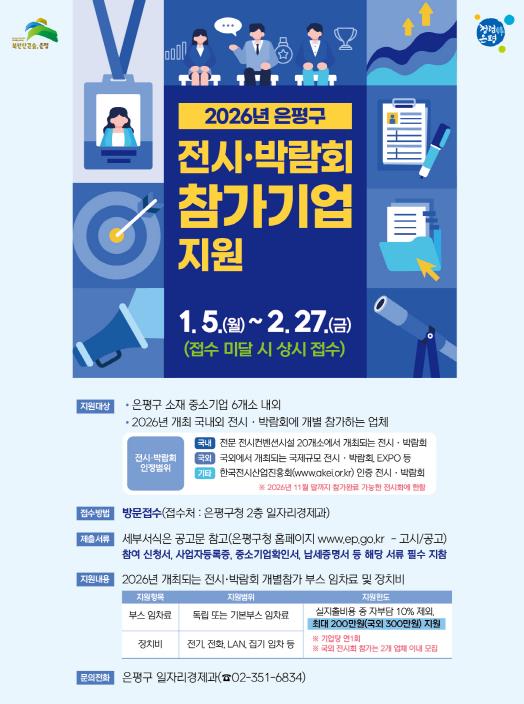[뉴스다컴] 서울 은평구는 내달 27일까지 ‘2026년 국내외 전시‧박람회 개별 참가 지원사업’에 참여할 기업을 모집한다고 밝혔다.
