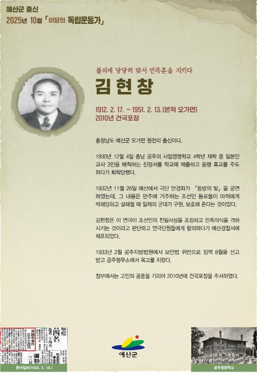 | ▲ 2025년 10월 이달의 독립운동가 포스터(김현창) |
