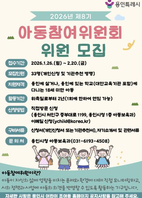 [뉴스다컴] 용인특례시는 1월 26일부터 2월 20일까지 아동정책 수립 과정에 적접 참여할 ‘제8기 아동참여위원회‘ 위원 33명을 모집한다.