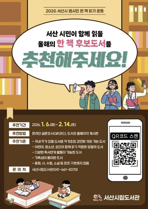 [뉴스다컴] 충남 서산시는 오는 1월 6일부터 2월 14일까지 2026년 범시민 한 책 읽기 운동의 후보 도서를 추천받는다고 밝혔다.