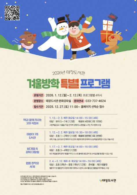 [뉴스다컴] 원주시 태장도서관은 겨울방학을 맞아 1월 12일부터 2월 12일까지 겨울방학 특별 프로그램을 운영한다.
