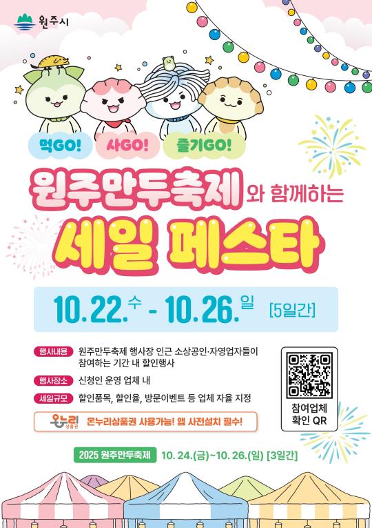 [뉴스다컴] 원주시는 지역 대표 축제인 원주만두축제와 연계해 구도심 상권을 활성화하기 위해 오는 22일부터 26일까지 5일간 ‘원주만두축제와 함께하는 세일 페스타’를 개최한다.