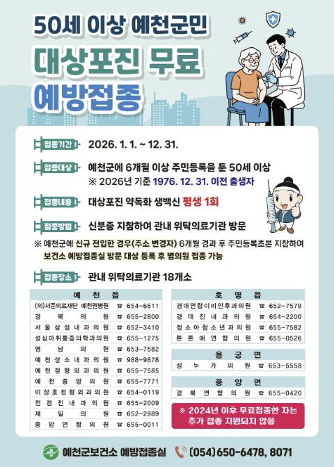 [뉴스다컴] 예천군은 2026년 50세 이상 대상포진 무료 예방접종 사업을 연중 실시한다.