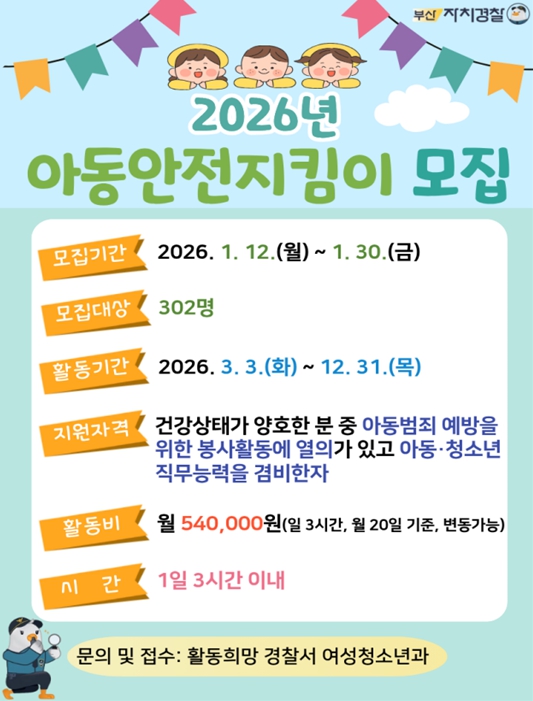 [뉴스다컴] 부산시 자치경찰위원회는 부산경찰청과 함께 오는 1월 12일부터 1월 30일까지 '2026년 아동안전지킴이'를 모집한다고 밝혔다.