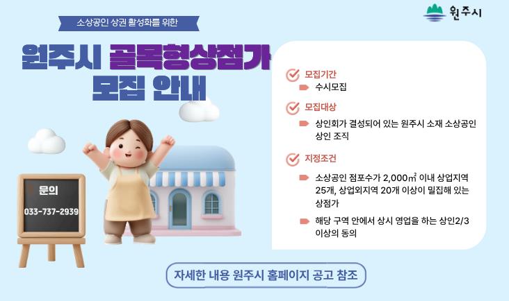 [뉴스다컴] 원주시는 소상공인 상권 활성화를 위해 1월 26일부터 ‘원주시 골목형상점가’ 지정을 희망하는 상인 조직을 모집한다.