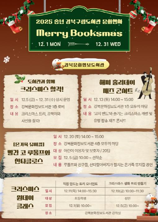[뉴스다컴] 서울 강북구는 강북구립도서관이 송년의 달과 크리스마스 시즌을 맞아 ‘2025년 강북구립도서관 송년의 달 기념 행사 Merry Booksmas(메리 북스마스)’를 운영한다고 밝혔다.