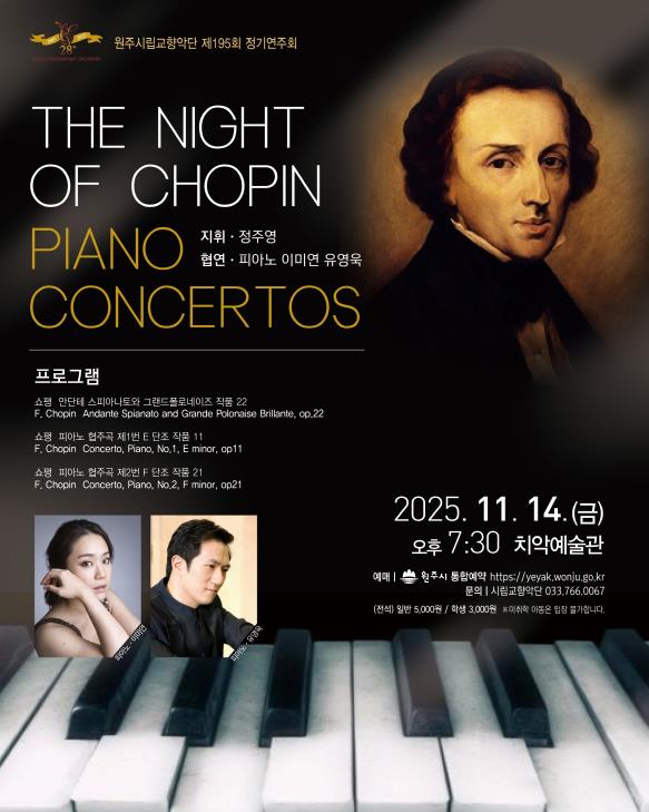 [뉴스다컴] 원주시립교향악단은 오는 14일 오후 7시 30분, 치악예술관에서 제195회 정기연주회 ‘The Night of CHOPIN’을 개최한다.