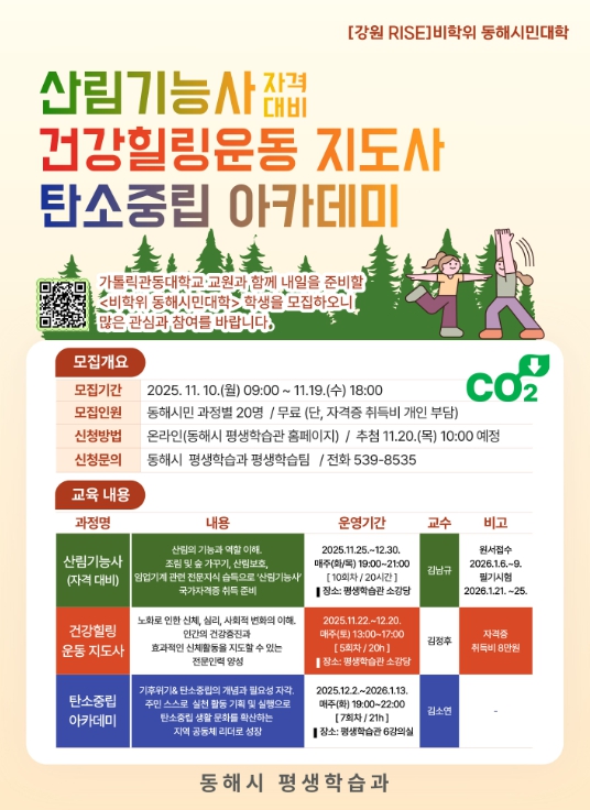 [뉴스다컴] 동해시는 시민의 평생학습 역량 강화를 위해 '비학위 동해시민대학' 전문과정으로 ▲산림기능사(자격대비) ▲건강힐링운동 지도사 ▲탄소중립 아카데미 3개 과정을 개설하고, 오는 11월 19일까지 동해시 평생학습관 홈페이지를 통해 수강생을 모집한다.