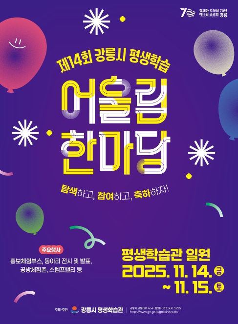 [뉴스다컴] 강릉시는 “탐색하고, 참여하고, 축하하자”를 주제로 한 '제14회 강릉시 평생학습 어울림 한마당' 행사를 오는 14일부터 15일까지 이틀간 강릉시 평생학습관 일원에서 개최한다.
