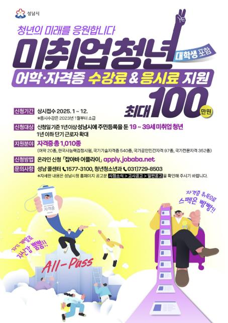 ▲ 성남시, 미취업 청년 어학·자격증 학원 수강료& 시험 응시료 지원 사업 안내 포스터 |