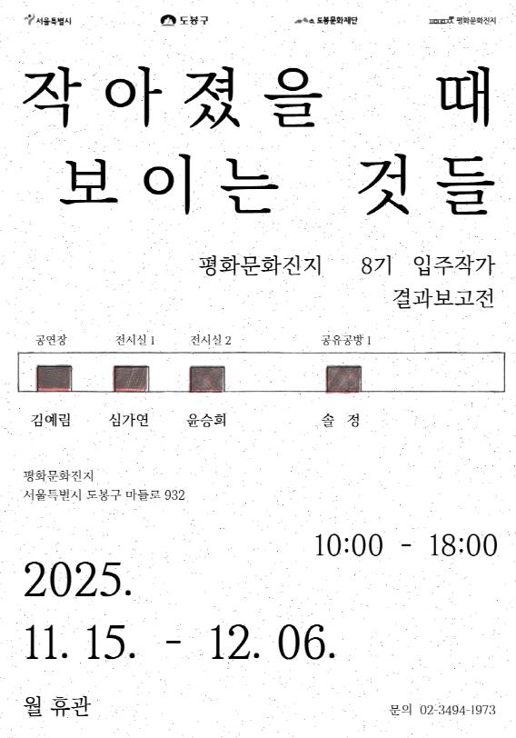 이번 전시에는 김예림, 심가연, 윤승희, 정솔 작가가 참여했다. 작가들은 올해 1월 평화문화진지에 입주해 작품 창작활동뿐만 아니라, ‘상·하반기 오픈스튜디오’, ‘2025 도봉문화이음제’ 등 다양한 프로그램에 참여하며 예술교육을 매개로 구민들과 소통했다.