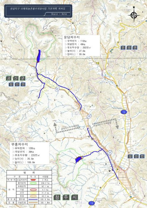 주요 사업 내용은 △문당저수지(유효저수량 22만1천㎥, 높이 27m, 길이 99m) △부흥저수지(유효저수량 20만2천㎥, 높이 26.6m, 길이 106m) 신설과 함께, △총 8.1km의 용수로(6조) △총 1.3km의 이설도로(3조)를 설치할 예정이다.