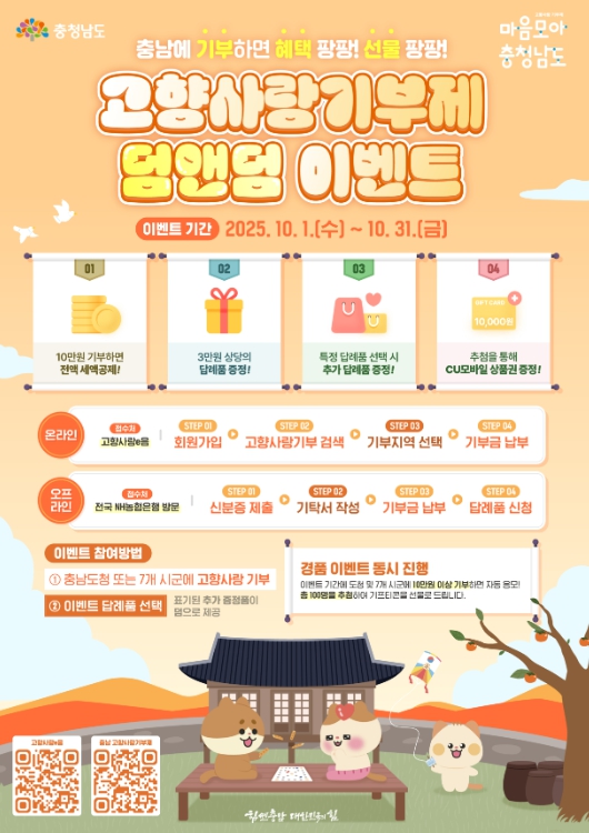 [뉴스다컴] 충남도는 천안·공주·보령·금산·서천·청양·예산 7개 시군과 10월 한 달간 ‘추석맞이 고향사랑 덤앤덤 이벤트’를 실시한다고 29일 밝혔다.