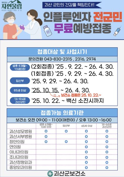 또한 국가예방접종사업 대상에 포함되지 않는 14~64세 괴산군민도 10월 22일부터 무료 접종이 가능하다.