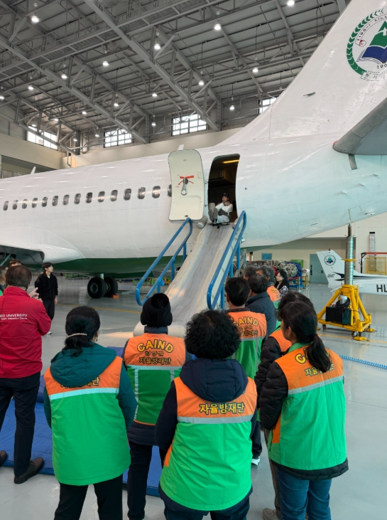 | ▲ 청양군 지역자율방재단 단원들이 한서대학교 재난안전교육원에서 항공기 비상탈출 체험교육을 받으며 실제 상황에 대비한 안전훈련을 실시하고 있다 |