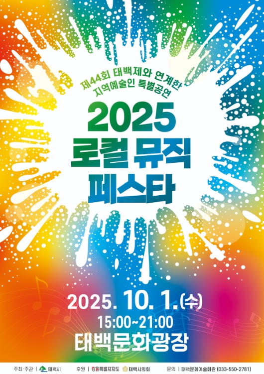 [뉴스다컴] 태백시는 제44회 태백제와 연계한 지역예술인 특별공연 '2025 로컬 뮤직 페스타'를 오는 10월 1일 오후 3시부터 9시까지 태백문화광장에서 개최한다고 밝혔다.