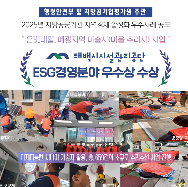 특히 공단은 2025년 상반기에만 총 10명의 시니어 기술자를 채용하여 659건의 수리·수선 사업을 수행했으며, 태백시와 한국노인인력개발원 등 유관기관과 협력해 폐광지역 맞춤형 노인일자리 모델을 구축한 점이 주목받았다.
