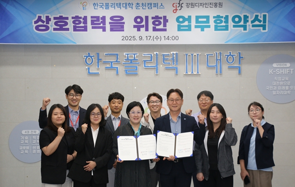 [뉴스다컴] 강원디자인진흥원은 9월 17일 한국폴리텍Ⅲ대학 춘천캠퍼스(학장 지경배, ‘한국폴리텍Ⅲ대학’)과 디자인산업 발전과 지역 인재 양성 상호협력을 위한 업무협약을 체결했다.