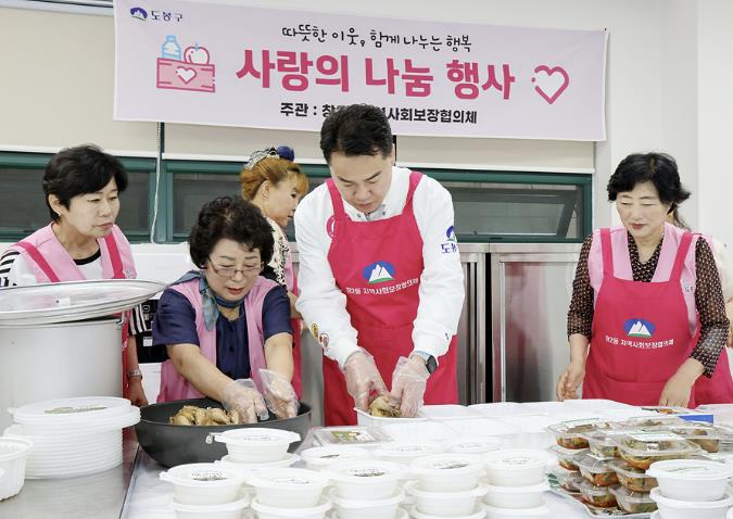 ▲ 오언석 도봉구청장(가운데)이 주민들과 창2동 주민센터 공유부엌에서 음식을 만들고 있다. |
